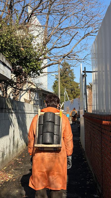 The volunteer group spent about two hours carrying and delivering briquettes along narrow alleys and steep slopes where vehicles could not enter, working up a sweat as they moved them by hand.